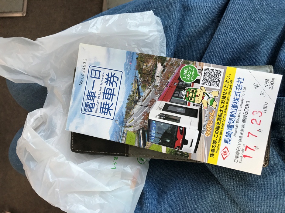从港口出来,我马上跑到商店买了一日车票券。这种券在一天之内可以无限次乘坐长崎市内的电车,方便又便宜。