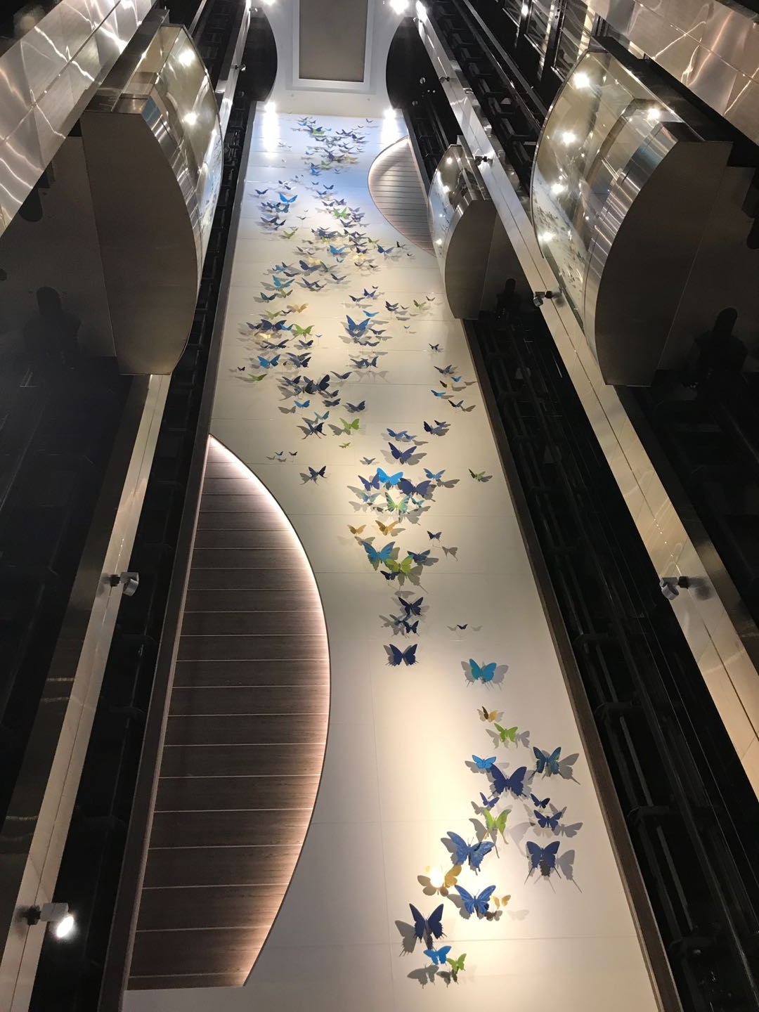 下楼的时候又看到了电梯井旁这一墙蝴蝶,我想,它们早就随着皇家量子号一起飞到我的心里去了吧。这是我第一次为一艘船写下文字,皇家加勒比真的给我带来了无限的欢乐,甚至到了两年后的今年,我依然记得船上的点点滴滴。